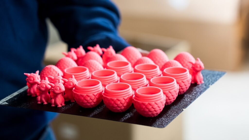 As he walks through the shop floor, Maurice checks on multiple jobs running on the printers: Christmas toys bound for a Toledo mall store, custom penholders, filament rings for 3D printing material, and local band merchandise embedded with QR codes.