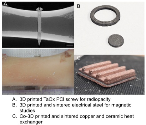 In parallel with our biomedical work, we are reducing the cost barriers of metal-sinter-based AM by studying powder-loaded polymer binder systems that can be printed, debound, and sintered into dense metal or ceramic components. In collaboration with Fraunhofer Institute for Manufacturing Technology and Advanced Materials (IFAM) in Dresden, Germany, we have developed scalable methods to co-print multiple materials—such as copper, ceramics, and copper–diamond composites—for customized thermal management devices. Currently, in partnership with Shanelle Foster, associate professor in the Department of Electrical and Computer Engineering at MSU, we are investigating how printing and sintering influence the properties of electrical steels, including iron–silicon alloys commonly used in electric motors. Understanding magnetic eddy current behavior in sintered, additively manufactured parts enables improvements in motor efficiency and power consumption, advancing 3D-printed magnetic motor technologies toward fully additive electric vehicles.