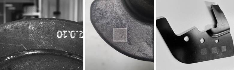 CDOT Code remains readable on a brake disc after heat treatment, shot blasting, and phosphating; on a crankshaft with a dark forged surface; and on an engine cradle after e-coating—ensuring reliable part traceability despite severe industrial conditions.